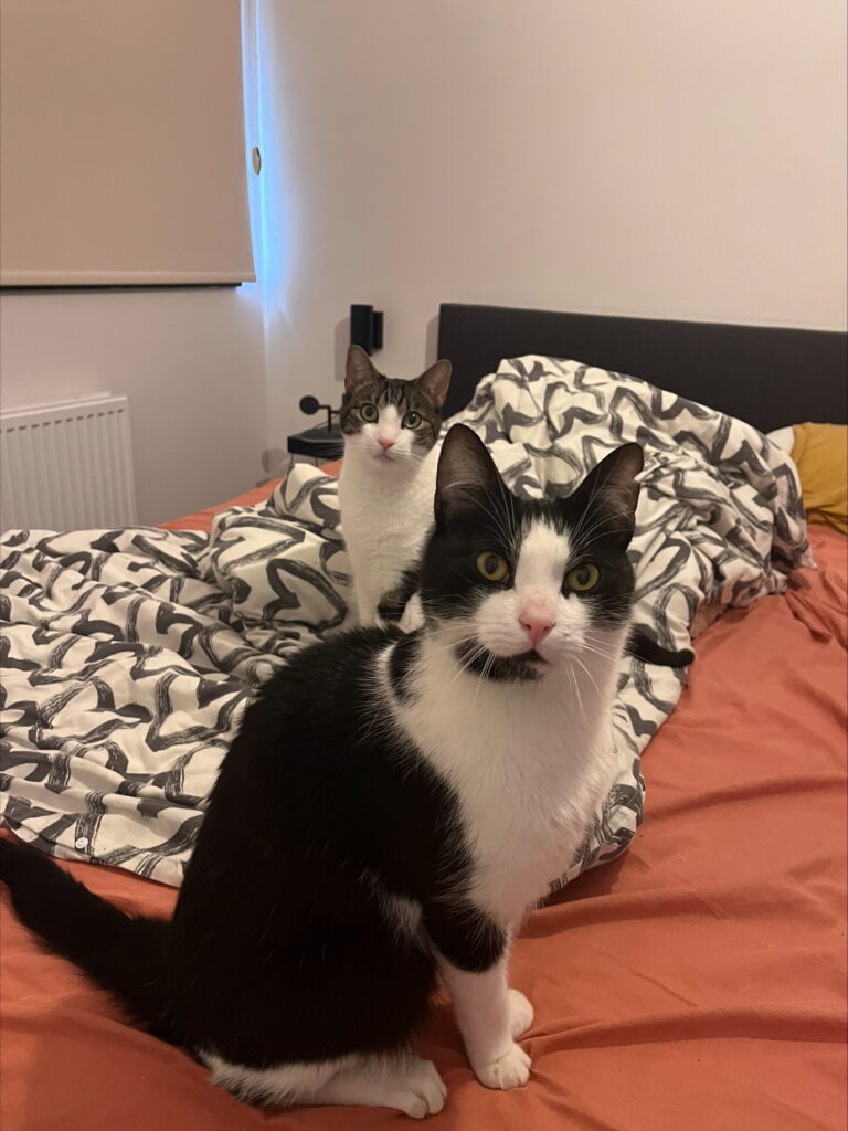 Fenrir: “Oh, en nog iets hé — wij houden allebei van lekker eten! We staan hier luidkeels te miauwen zodra er iets met eten te maken heeft. Het was ons bijna gelukt om twee keer ontbijt te krijgen… jammer genoeg communiceren onze baasjes iets te goed met elkaar. Volgende keer lukt het vast!”
